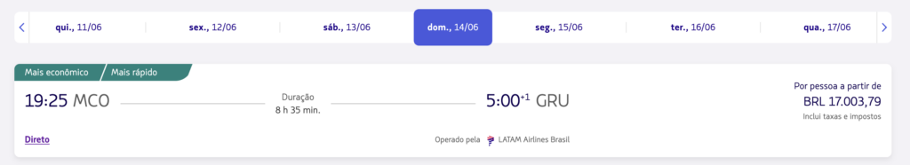 Eu estava caçando MCO → GRU (Orlando para São Paulo) em Business na LATAM, e a sensação inicial foi: “ok, vai ser sofrimento”. O mesmo voo em dinheiro estava custando R$ 17.003,79 — e isso te mostra o nível de loucura do período de Copa.